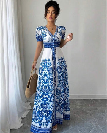Elenzga New Design Women's Blue & White Woven Positioned Floral Print V-Neck Puff Sleeve Waist Cinched Floral Print Elegant Midi Dress, Flattering, Sophisticated Middle East Style